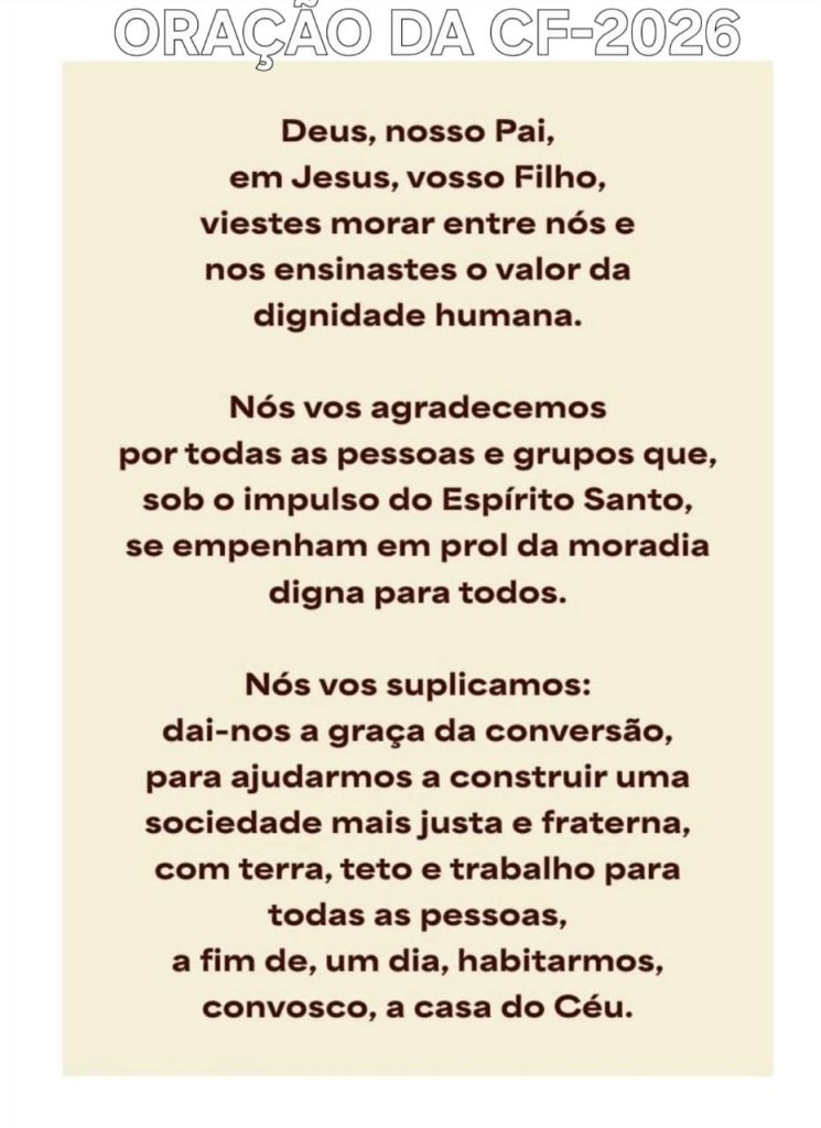 Jesus, nosso amigo, quando morastes na terra, nos ensinastes que todos são importantes para Deus. Nós vos pedimos pelas pessoas, especialmente pelas crianças, que não têm moradia digna, pelas que vivem nas ruas e que têm dificuldade de ir para a escola, pelos estrangeiros que não se sentem acolhidos em nossas cidades e por tantos outros que sofrem preconceitos por serem pobres. Ajudai-nos a ser fraternos e solidários com as pessoas que mais necessitam e a ser gratos pela moradia que temos. Dai-nos coragem para sermos construtores de uma sociedade mais acolhedora, inclusiva e justa. Que todos possam morar bem, ter saúde e ser felizes. Sabemos o carinho que vós tendes por nós. Não nos deixeis esquecer que a vossa felicidade se realiza quando cuidamos da nossa Casa Comum, na qual moramos junto com os nossos irmãos e irmãs, pessoas e os demais seres vivos. Amém.